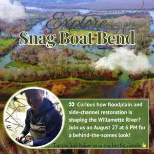 Join us to see how our floodplain and side channel habitat restoration work on the Willamette River is looking! With funding and support from the Oregon Watershed Enhancement Board, Bonneville Power Administration, and Meyer Memorial Trust we have worked at this unit of William L. Finley Wildlife Refuge for the last 10 years to reconnect the river to its floodplain and restore floodplain forest. Snag Boat Bend is owned by you and managed by the U.S. Fish and Wildlife Service for wildlife habitat and compatible human recreation. We are close to completing a capstone project at the site that has been in development since 2018 – the partial removal of a large revetment built by the U.S. Army Corps of Engineers in 1964. We will be removing a portion of the revetment to restore flow into a 1+ mile long historical channel segment that has been choked out by non-native aquatic plants to make it more friendly for native aquatic species like juvenile spring Chinook salmon, Pacific lamprey, and coastal cutthroat trout. We have worked closely with engineers, the Army Corps and other agencies to ensure that the project will not have any negative impacts to other people on the dynamic Willamette River. We have finalized the designs and are close to acquiring the permits for the project, and there is a chance that the project will happen at the end of this summer or early fall, or at latest early next summer.